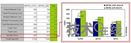 下面來看LED TV與現有CCFL背照燈液晶電視的價格差(圖3)。截至2009年10月,在美國市場上,配備CCFL背照燈的32英寸/40英寸/46英寸液晶電視與配備邊緣發光型白色LED背照燈的32英寸/40英寸/46英寸液晶電視的平均售價相比,LED TV的價格高于前者,32英寸約為前者的2倍,40英寸約為前者的1.4倍,46英寸約為前者的1.5倍。