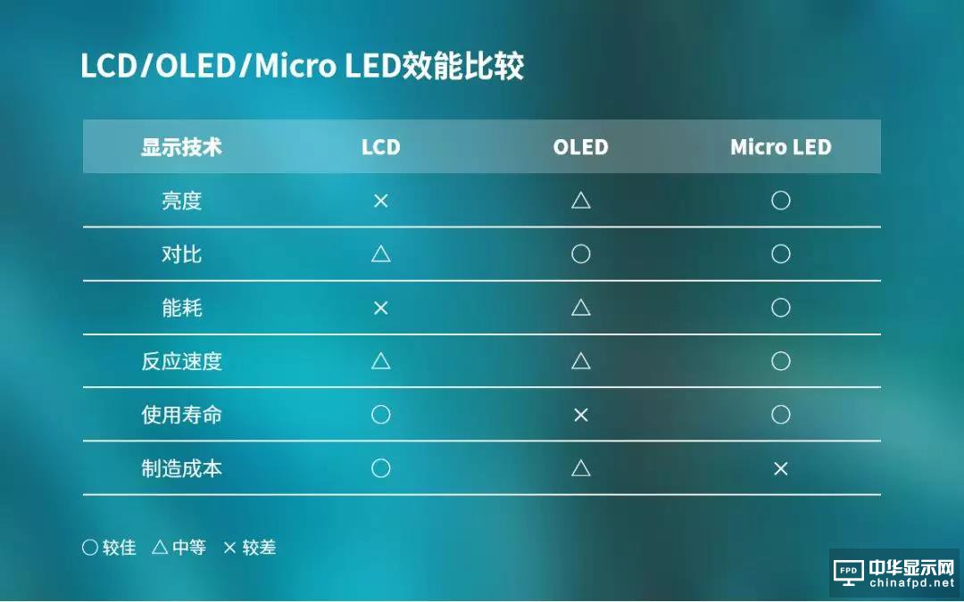 以Mini LED來說,這樣的發展趨勢在2020年就能逐漸被看到。至于尚未量產的Micro LED,作為顯示器,要面臨的是技術相對成熟的LCD和OLED技術,各種效能優勢更需要時間來驗證(參考下表)。