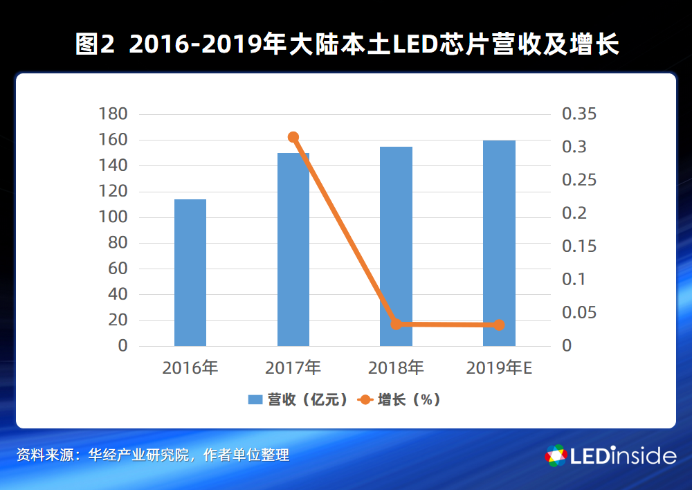 市場規模增長放緩,市場價格下跌,一線大廠三安、華燦、澳洋順昌等因擴產,營收仍保持穩步上升,而中小型廠商由于產能沒有增加,營收下滑,中國大陸總體LED芯片營收增速放緩。