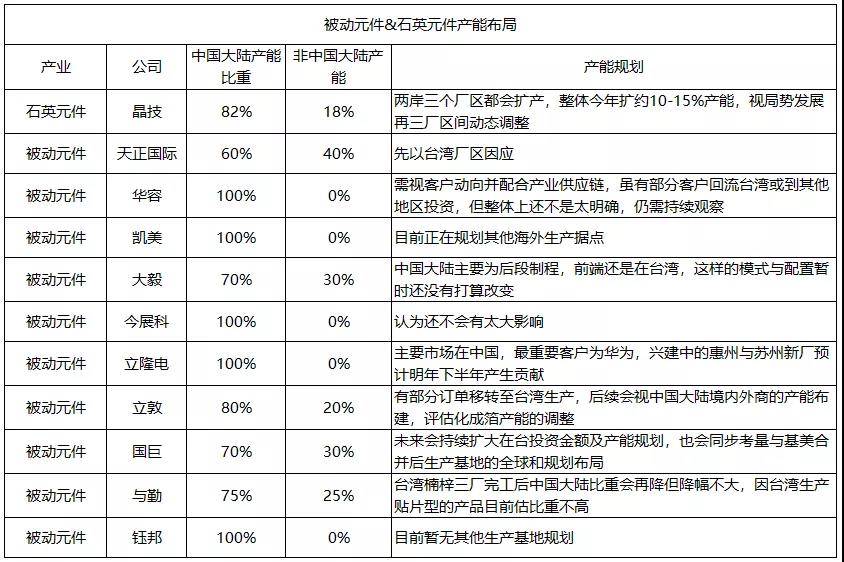 被動組件廠部分,目前產能高度集中在中國大陸的廠商中,多數仍未有異動打算,主要是被動組件輕薄短小的產品特性,對終端廠商而言,還不足以對成本形成嚴重威脅,后續待態勢更加明確再轉移也不遲。