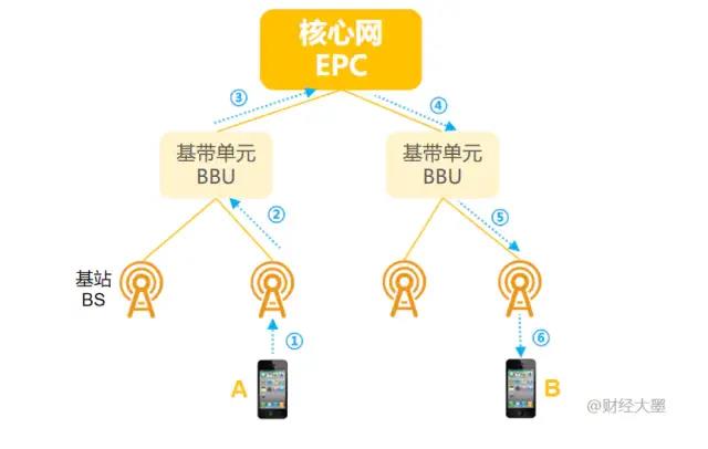 語音傳輸的路徑更是非常麻煩,如圖5所示,A想給B打個電話需要經過很長的物理路徑,需要沿著藍色的路徑,經過8個階段才能把語音傳輸到B,2G和3G的語音過程都是這樣。