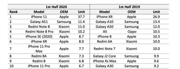 小米銷量暴漲,和Redmi的極致性價比路線也有很大關系,在今年上半年全球暢銷手機排行榜,iPhone 11毫無懸念拿下第一,三星A51第二,Redmi Note 8和Note 8 Pro包攬三四名。前十名除了一款三星之外,基本上被蘋果和紅米瓜分,可見小米在全球范圍內的銷量提升了不少。