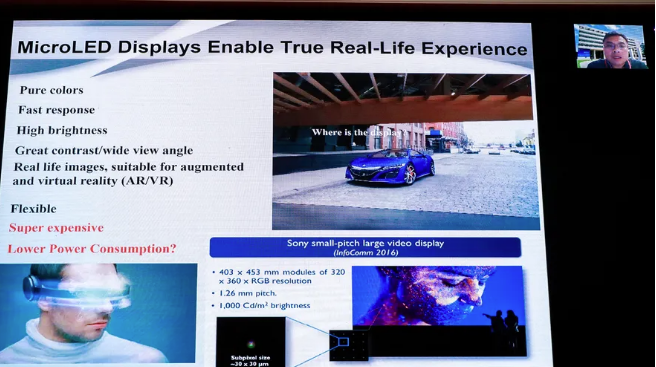 郭浩中分享了現在很紅的mini LED和MicroLED的對比,Mini LED現在大量做車用。MicroLED小于50微米,最小到2微米,從更精密的顯示,AR/VR有更大的優勢。這是MicroLED的挑戰,他認為full color是最大的挑戰。他提出,blue chip經過巨量轉移,最后綠色和紅色的量子點做轉換。QD 解決方案是下一代的顯示,隨著量子點大小的變化,量子點的顏色可以慢慢從紅色變到綠色,再慢慢變到藍色。