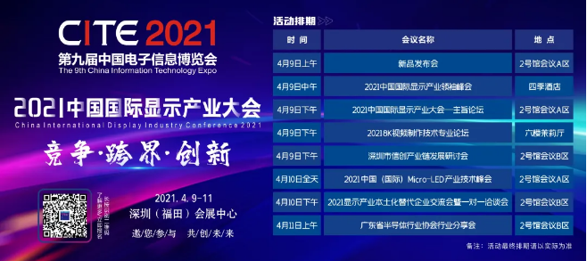 2021年4月9日—11日,以“創新驅動 高質量發展”為主題第九屆中國電子信息博覽會(CITE 2021)將在深圳會展中心盛大舉辦。展會同期將舉辦2021中國國際顯示產業大會,本次大會將聚焦顯示產業各領域熱點話題,通過豐富多彩的系列活動,共同探索行業新機遇,共促行業新發展。