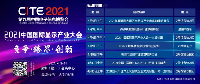 2021年4月9日—11日,以“創新驅動 高質量發展”為主題第九屆中國電子信息博覽會(CITE 2021)將在深圳會展中心盛大舉辦。展會同期將舉辦2021中國國際顯示產業大會,本次大會將聚焦顯示產業各領域熱點話題,通過豐富多彩的系列活動,共同探索行業新機遇,共促行業新發展。