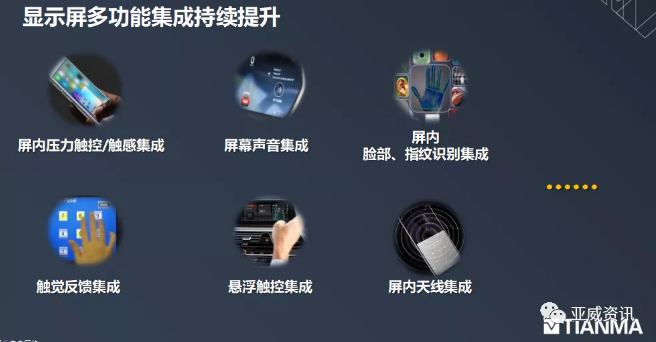 三是智物聯場景化應用,例如在智能家居方面它要求要酷炫、智能化;對于新零售它要求帶來更智能便捷的購物體驗,此外,在醫療、農業、城市、教育相關的行業對顯示技術也提出了不同的要求。顯示屏除了作為一個簡單的信息顯示終端,要求有更多的交互性,需要將觸控、指紋識別、觸覺反饋、聲音、天線等內容集成到屏中,使它成為更加智能化多功能的交互終端界面。