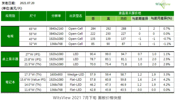 根據Witsview 統計,7月下旬32、43吋電視面板轉跌;55吋電視面板止漲,7月報價227美元,與上月持平;65吋以上大尺寸電視維持漲勢,但漲勢收斂,7月平均上漲1美元平均報價288美元。