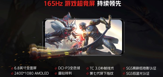 根據紅魔發布信息顯示,該屏幕采用無挖孔設計,前攝位于屏幕上方,保證游戲時畫面無遮擋,同時具有低藍光認證、屏下指紋識別技術。為滿足游戲操作,屏幕的多指觸控采樣率可達720Hz,也屬目前手機中的最高水平。