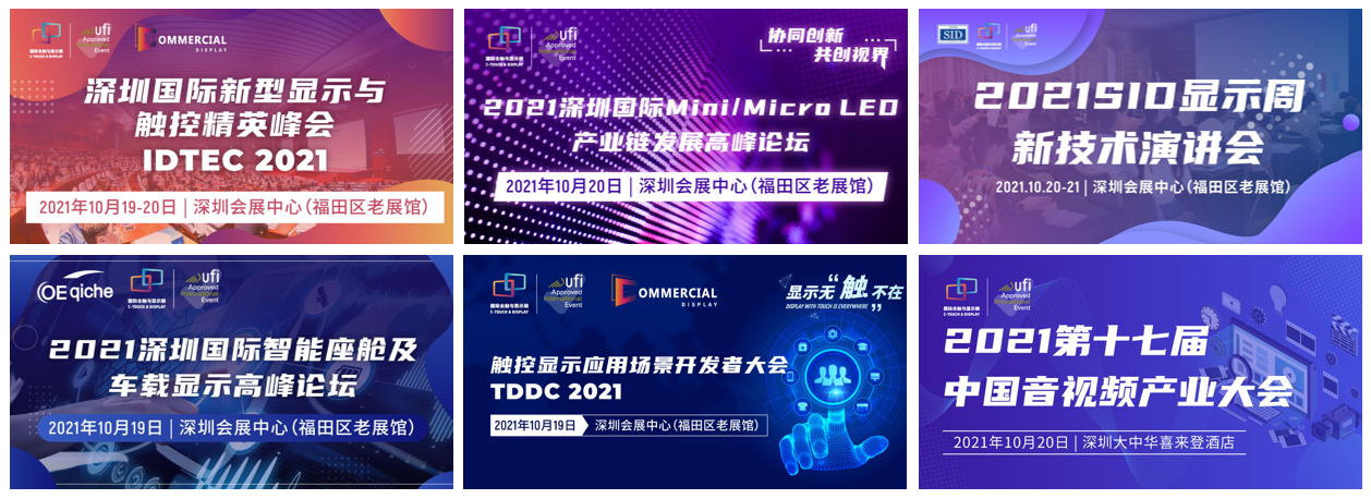 2021深圳國際全觸與顯示展精心組織了包含2021深圳國際新型顯示與觸控精英峰會、2021觸控顯示應用場景開發者大會、2021第十七屆中國音視頻產業大會、2021深圳國際智能座艙及車載顯示高峰論壇、2021全球 Mini/Micro-LED產業協同創新峰會、2021年SID顯示周新技術演講會、第六屆 賦能 | AR/VR跨界融合創新論壇、2021物聯網技術與應用高峰論壇、2021第四屆全球商用顯示應用與創新主題論壇等高峰會議論壇等前沿峰會,將圍繞觸控顯示前沿趨勢、新型觸控顯示技術、Mini&Micro-LED技術、觸控顯示應用場景、音視頻產業應用、車載電子、商用顯示、物聯網、AR/VR、5G新材料、攝像模組等最前沿技術領域展開深度討論。每一場會議論壇都有知名專家學者坐鎮,與您密切互動,思想碰撞。若有一個領域或技術能引發您的興趣,那么就去聽一聽吧,或許會有意外的收獲。