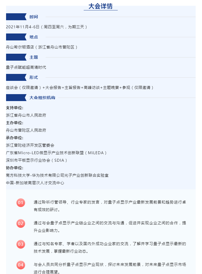 2021年11月4日-6日,全球首屆以“量子點賦能超高清時代”為主題的量子點顯示領域的專題會議——“2021中國(普陀)國際量子點顯示產業大會”將在浙江舟山普陀區舉辦。