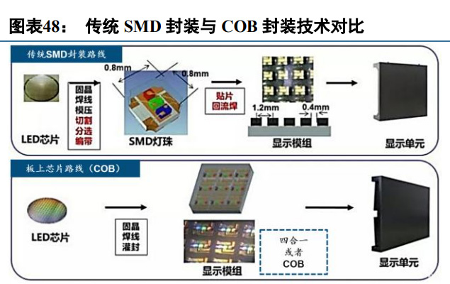 COB工藝(Chip on Board,板上芯片封裝技術)將LED芯片直接粘附在基板上,最后通過引線鍵合將芯片與PCB板間電互連,實現集成封裝相對于傳統的SMD封裝,COB具有制造工藝流程少、封裝集成度高、精度高、顯示屏的可靠性好和顯示效果均勻細膩等特點,有望成為未來高密度LED顯示屏模組的一種重要的封裝形式。但目前COB封裝也面臨制造成本高,良率低,工藝難度高等問題。從產業鏈環節上看,采用COB工藝后,中游封裝環節具備高度集成性,因此具備更高的附加值,下游顯示屏則更多承擔組裝性的工作。
