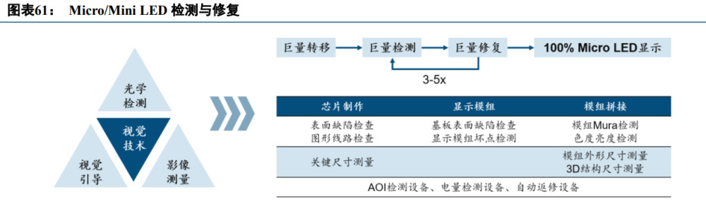 Mini LED AOI設備涉及較大投入。Mini LED可通過AOI(Automated OpticalInspection,自動光學檢測)設備進行檢測,應用視覺方案檢測固晶和焊接情況、產品、外觀情況,同時可對點亮后的LED進行測試。目前Mini LED封裝測試領域設備的種類繁多,各廠商提供的設備路線與工藝路線差別較大。由于Mini LED相比傳統LED對于不良率的要求更高,也要求封裝廠進行較多的AOI設備投入,做到全流程的閉環管理,大概生產流程的7-8個步驟都需要AOI設備,而且每個步驟需要的不僅僅是一臺AOI機臺,對AOI機臺的需求量有較大提升。