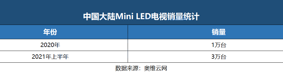 在主流電視品牌的推動下,Mini LED電視概念火熱,但是市場表現卻不如預期。奧維云網報告指出,2020年Mini LED電視銷量達1萬臺,2021年上半年Mini LED電視銷量僅3萬臺。奧維云網已經將2021年Mini LED電視市場規模從25萬臺降至15萬臺左右。GfK更加不看好Mini LED電視市場,甚至預計,2021年中國Mini LED電視的零售量規模僅為7萬臺。