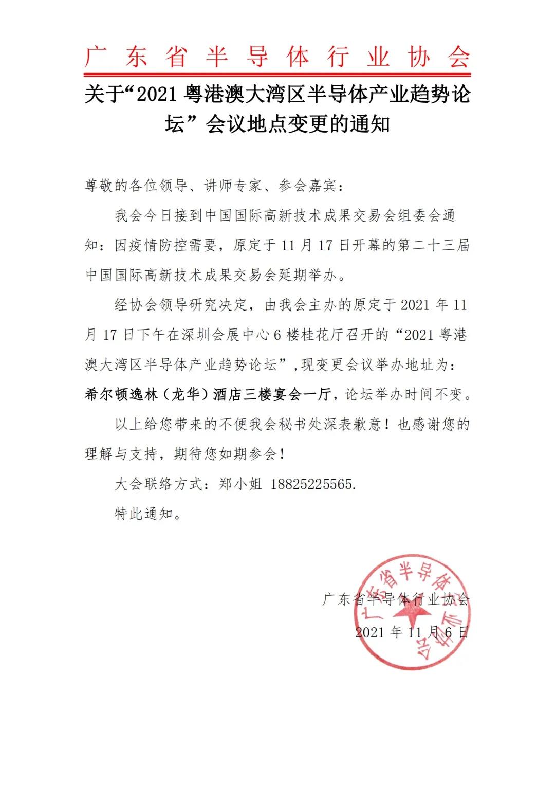 關于“2021粵港澳大灣區半導體產業發展趨勢論壇”會議地點變更的通知