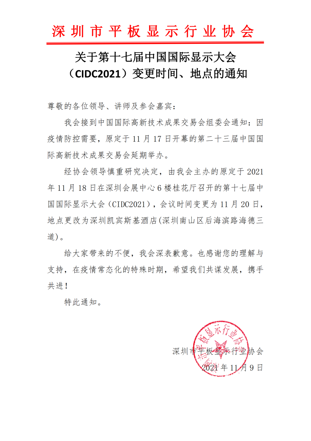 關于第十七屆中國國際顯示大會(CIDC2021)變更時間、地點的通知