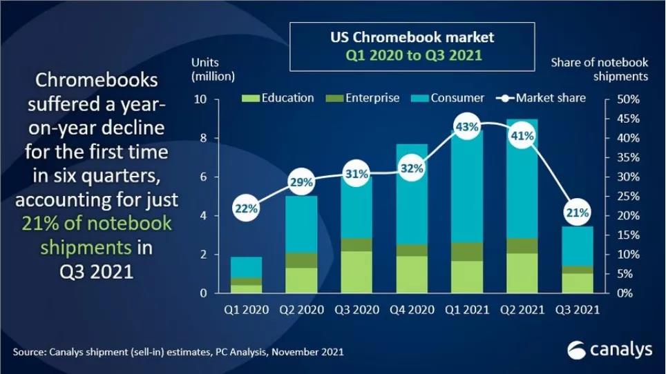 對此,Canaly分析師布賴恩?林奇 (Brian Lynch) 表示:“在連續幾個季度實現兩位數增長后,美國PC市場已經放緩。”盡管如此,與新冠大流行前的水平相比,總體出貨量仍然很高。而下降的主要原因是教育和消費領域的需求飽和,導致 Chromebook 和平板電腦出貨量急劇下降。目前,新冠大流行帶來的需求已迅速減少,而消費者期待著假日季節的誘人優惠。