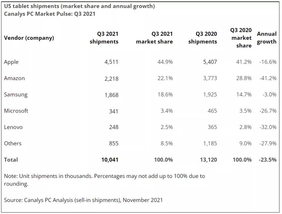 此外,美國平板電腦出貨量在第三季度下降了 23% 以上,原因是支持增加屏幕訪問、基本計算和連接的需求下降。由于 iPad 在美國市場占主導地位,蘋果公司以 45% 的市場份額穩居第一。雖然亞馬遜的平板電腦出貨量下降了 41%,但仍然位居第二名。因為其低成本的安卓機型仍然受到兒童和贈品市場歡迎。三星在前五名供應商中跌幅最小,出貨量下降 3% 至 190 萬臺。微軟和聯想位列第四、第五,出貨量均出現兩位數的大幅下降。