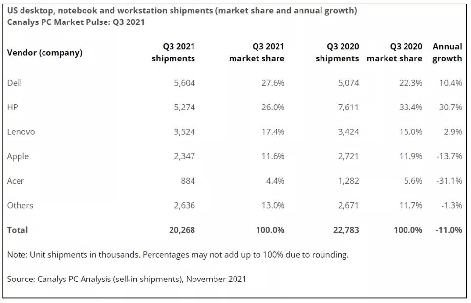 市場調研機構 Canalys 發布的報告顯示,2021 年第三季度,美國臺式機、筆記本電腦、平板電腦和工作站的出貨量為3030萬臺,同比下降 16%。