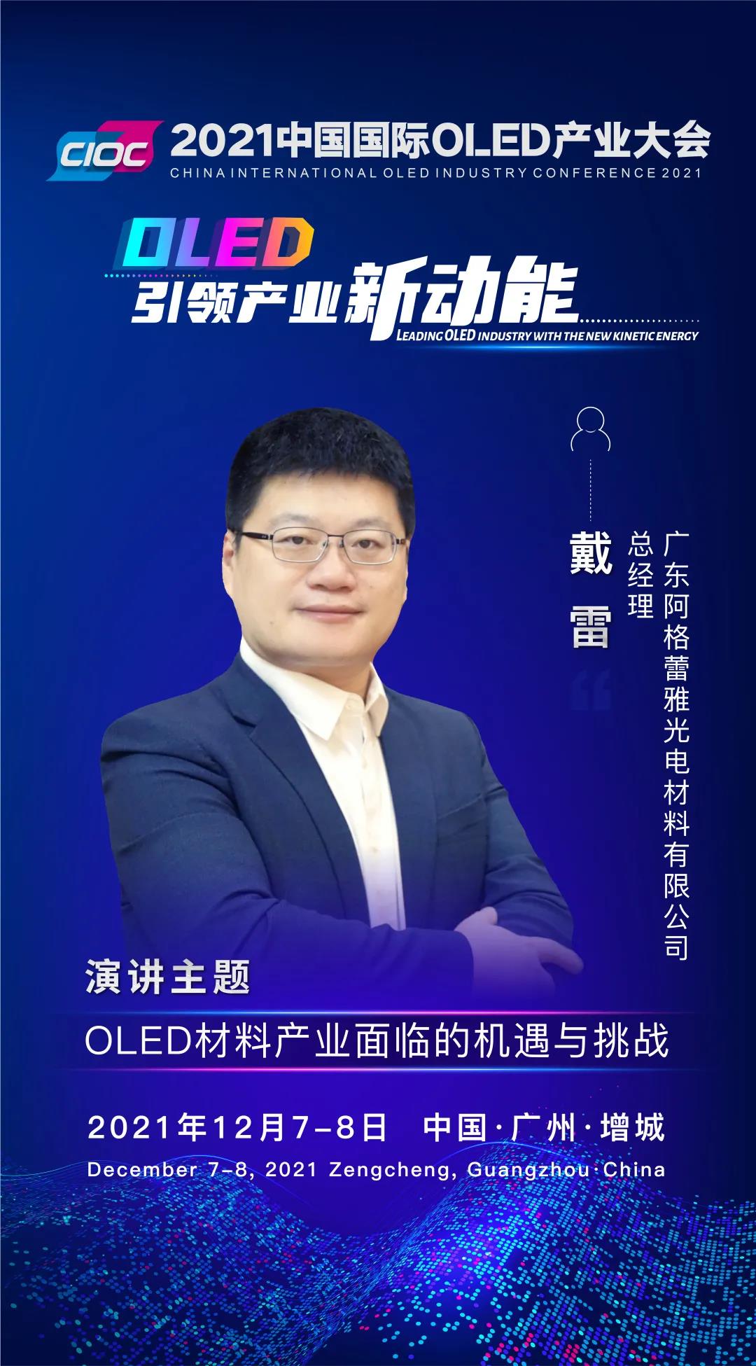 戴雷,廣東阿格蕾雅光電材料有限公司總經理,教授級高級工程師,香港大學化學系兼職教授,中科院物理研究所凝聚態物理博士。戴雷博士于2004年畢業于中國科學院物理研究所凝聚態物理專業,后創辦廣東阿格蕾雅光電材料有限公司,公司致力于自主知識產權的OLED材料的研究開發、生產、銷售及技術解決方案等領域。戴雷博士具有超過15年的OLED材料研發及生產管理經驗,其公司研發團隊關注目前困擾國內OLED行業的關鍵材料瓶頸問題,其領導開發的如多類OLED材料已處于國際先進水平,系列產品已在國內外大型OLED面板廠獲得應用。