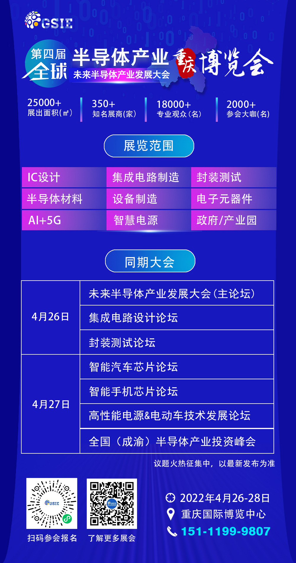 第四屆全球半導體產業(重慶)博覽會(簡稱“GSIE 2022”)將于2022年4月26-28日在重慶國際博覽中心舉行,為2022年半導體產業升級聚勢發力!博覽會由中國電子學會、中國汽車工業協會、重慶市經濟和信息化委員會共同作為支持單位,重慶市電子學會、四川省電子學會、重慶市半導體行業協會、重慶市電源學會、重慶市電子電路制造行業協會共同主辦,以聯動行業權威力量,開啟芯風向!