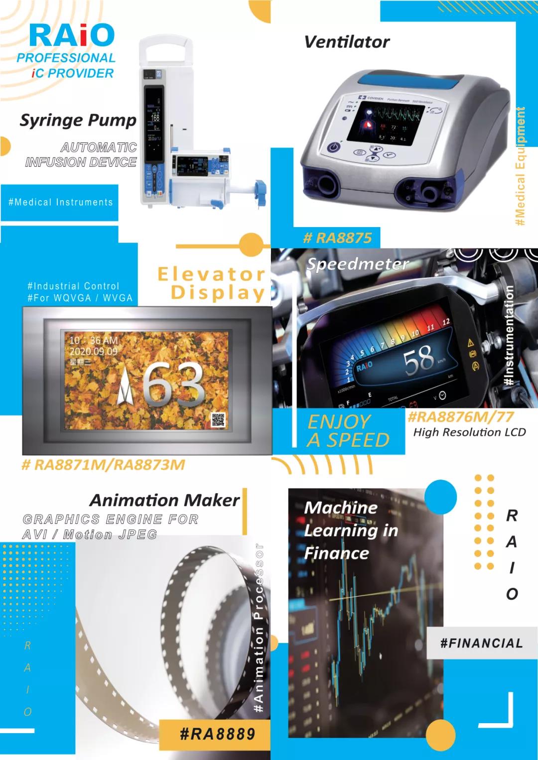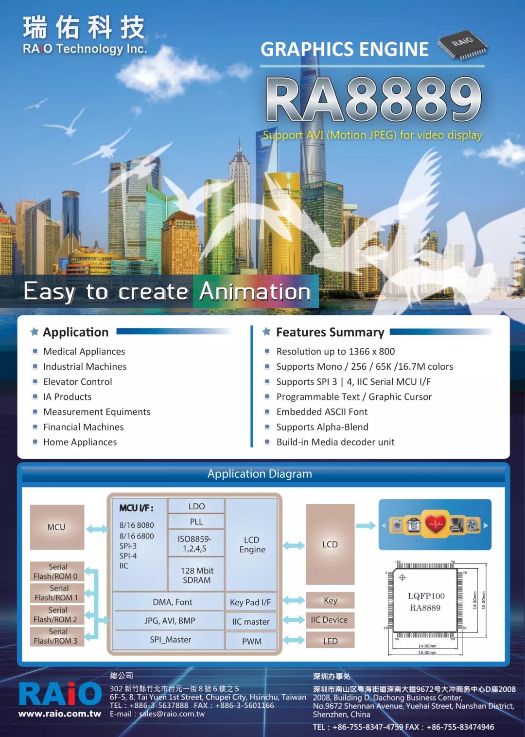RAiO offer many high integration LCD controllers and compatible chips world-wide. Customers use RAiO chips in many advanced 3C ,IA products and control panel for wide range of equipments. Main products are RA8875、RA8871M、RA8873M、RA8876、RA8877、RA8889.