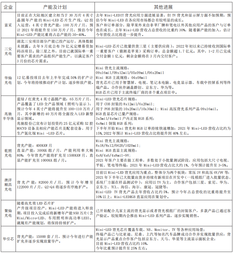 2021年,富采、三安光電、華燦光電、兆馳股份、澳洋順昌光電、聚燦光電、乾照光電、amsOSRAM等芯片相關上市企業均加大對Mini-LED領域的投資,并穩步地推進Mini-LED背光、RGB直顯相關的擴產計劃或項目。
