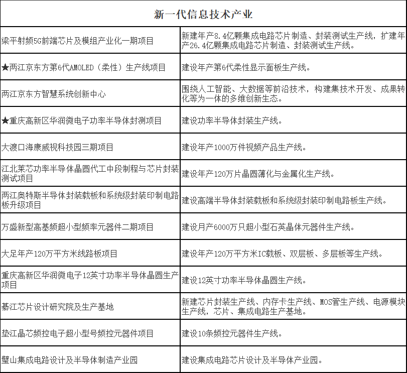 重大建設項目涉及晶圓制造、封裝測試、射頻模組等,其中兩江京東方第6代AMOLED(柔性)生產線項目、重慶高新區華潤微電子功率半導體封測項目、重慶高新區華潤微電子12英寸功率半導體晶圓生產項目、江北萊芯功率半導體晶圓代工中段制程與芯片封裝測試項目、兩江奧特斯半導體封裝載板和系統級封裝印制電路板升級項目等多個項目上榜。