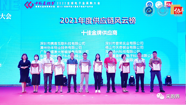 2021年度十佳金牌供應商獲獎名單:深圳市攜客互聯科技有限公司、漳州協豐物業服務有限公司、廣東飛鐳激光智能裝備有限公司、東莞市鈿威科技有限公司、富滿微電子集團股份有限公司、深圳市普榮實業有限公司、佛山市天奇銅業有限公司、深圳揚興科技有限公司、廣東富盈精密電子科技有限公司、廣東萬連科技有限公司。