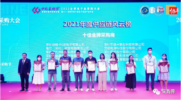 十佳金牌采購商、十佳金牌供應商、年度優秀供應商:他們是電子信息產業供應鏈領域年度最具標志性和影響力的高端獎項,力推持續發掘和培養一批電子信息產業供應鏈創新與應用的示范企業和領軍人才,為政府政策制定、行業示范對標、產業鏈采購尋源等提供支持。2021年度十佳金牌采購商獲獎名單:深圳創維-RGB電子有限公司、海爾(深圳)研發有限責任公司、深圳市九洲電器科技有限公司、深圳康佳通信科技有限公司、四川領歌智谷科技有限公司、深圳市綠米聯創科技有限公司、茂碩電源科技股份有限公司、深圳拓邦股份有限公司、深圳市普渡科技有限公司、深圳市銀星智能股份有限公司。