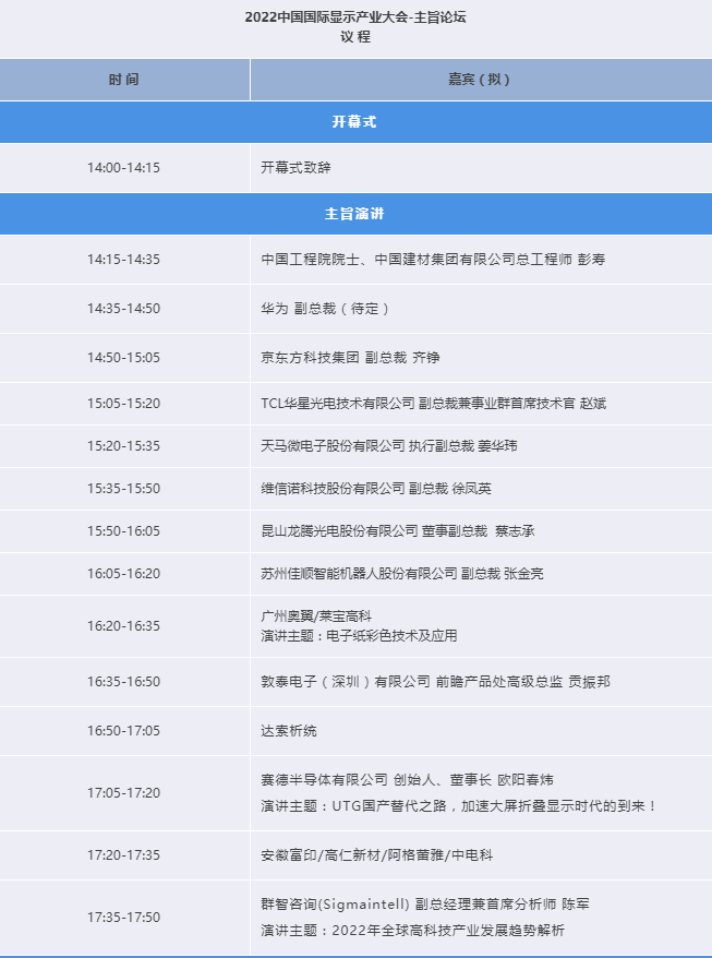 作為本次大會的重頭戲——“2022中國國際顯示行業大會-主旨論壇”將邀請華為、京東方、TCL華星、維信諾、天馬、龍騰光電、敦泰、三利譜、萊寶高科、廣州奧翼、佳順智能、達索、群智咨詢等領軍企業代表作主題報告。大會將匯聚全球顯示產業精英,聚焦顯示產業各領域熱點話題,通過豐富多彩的系列活動,共同探索行業新機遇,共促行業穩中求進,融合創新,實現高質量發展。