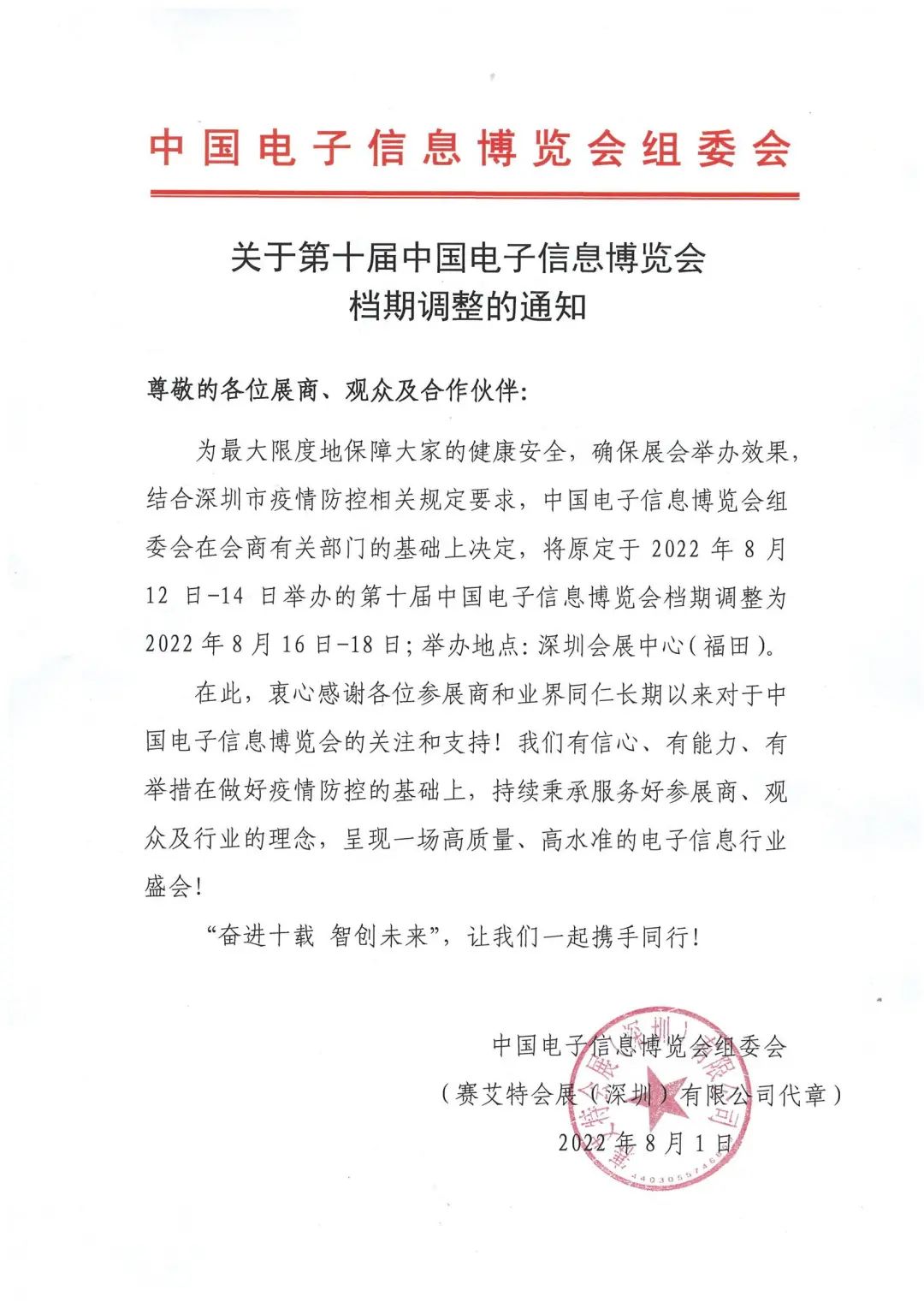 為最大限度地保障大家的健康安全,確保展會舉辦效果,結合深圳市疫情防控相關規定要求,中國電子信息博覽會組委會在會商有關部門的基礎上決定,將原定于2022年8月12日-14日舉辦的第十屆中國電子信息博覽會檔期調整為2022年8月16日-18日;舉辦地點:深圳會展中心(福田)。