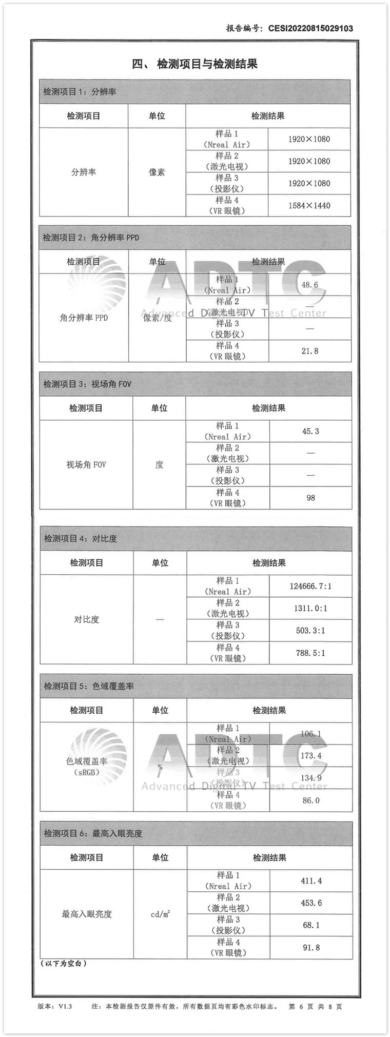 檢測報告顯示,在分辨率方面,Nreal AR眼鏡與主流的激光電視和投影儀保持一致,均達到了1920×1080級別,四款產品相差不大。在XR設備的核心清晰度指標“角分辨率”上,Nreal AR眼鏡達到48.6像素/度,VR眼鏡為21.8像素/度;而視場角(FOV)方面,VR眼鏡則因為封閉式視覺的產品特性,高于Nreal AR眼鏡。