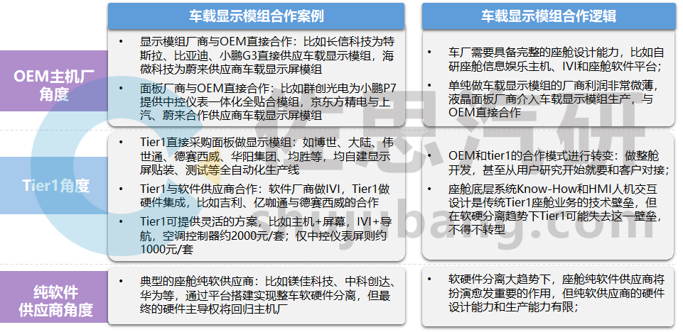隨著主機廠軟件能力的提升,軟硬件分離的趨勢越來越明顯,主機廠開始自研座艙主機、IVI和軟件平臺,車載面板和模組供應商業模式將發生變革,逐漸形成“OEM+面板(模組)廠商”的全新供應模式,傳統的座艙顯示Tier1面臨挑戰。面板(模組)廠商將逐漸扮演車載顯示模組Tier1角色,典型廠商包括深天馬、京東方精電、信利國際、群創光電等,面板廠商可以為OEM直接提供一體化封裝的模組產品,除傳統的中控儀表,面板(模組)廠商和OEM還將進一步合作探索透明車窗顯示,極窄邊框車載顯示屏,柔性OLED,3D曲面顯示技術,AR-HUD, OLED車尾燈等。例如,友達光電和群創光電直接向美國汽車整車廠提供全mini LED背光顯示模塊;三星顯示與奧迪公司緊密合作開發OLED產品;特斯拉則主導了關鍵顯示部件的采購,指定顯示模組廠商進行封裝。下一步,面板供應商將加強與汽車整車廠的合作關系,向主機廠直接提供下一代顯示技術,以創造新的價值點。