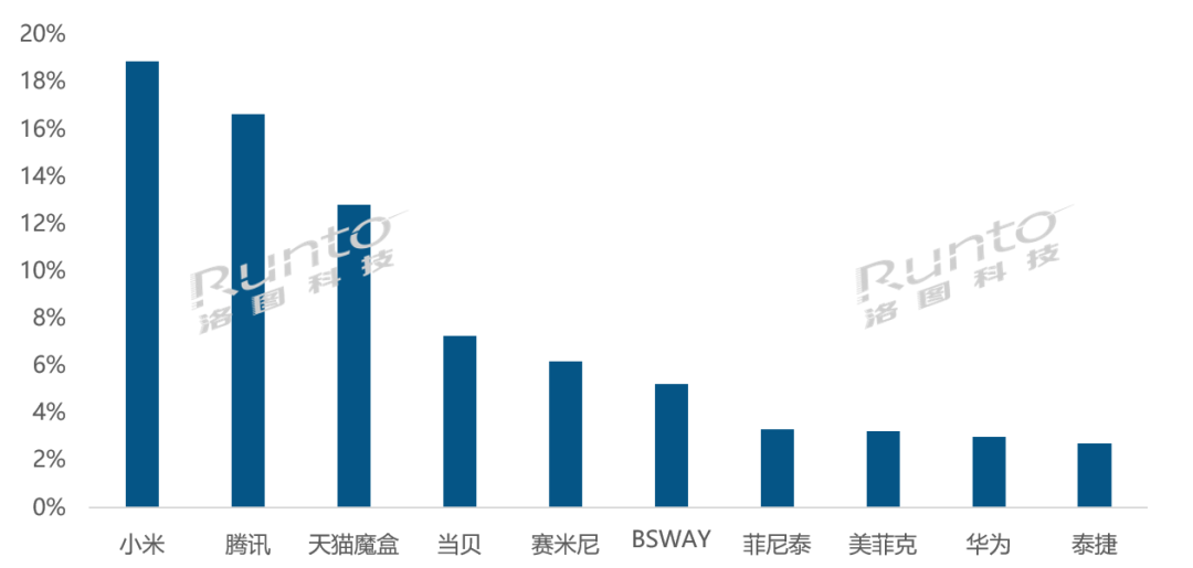 主流品牌占據主導地位,TOP4品牌為小米、騰訊、天貓魔盒及當貝,合計份額(CR4)為55.7%,較去年同期下降13.2個百分點,但仍呈現寡占型競爭格局。
