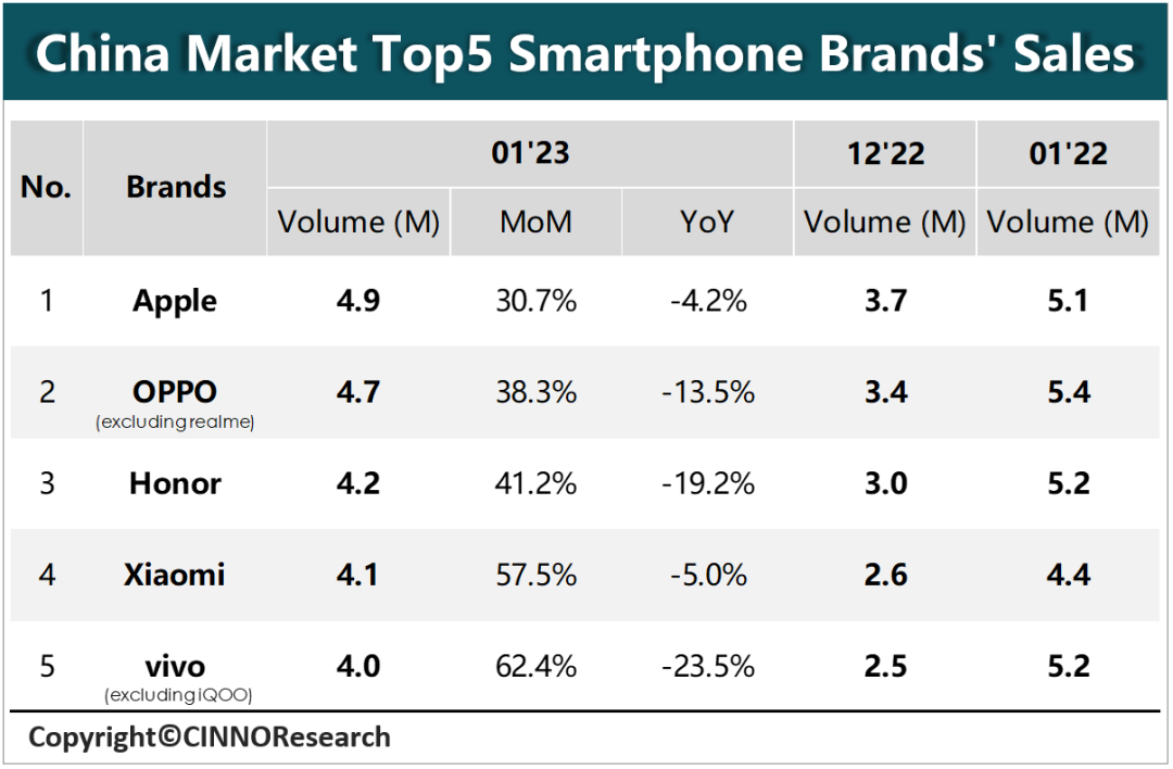 1月國內智能機市場Top5主流品牌銷量同比均呈現負增長,降幅4.2%-23.5%區間,安卓陣營僅小米銷量同比跌幅小于智能機整體降幅,OPPO/榮耀/vivo同比降幅顯著,分別為13.5%、19.2和23.5%;蘋果手機品牌表現優于安卓陣營,銷量同比降幅4.2%。