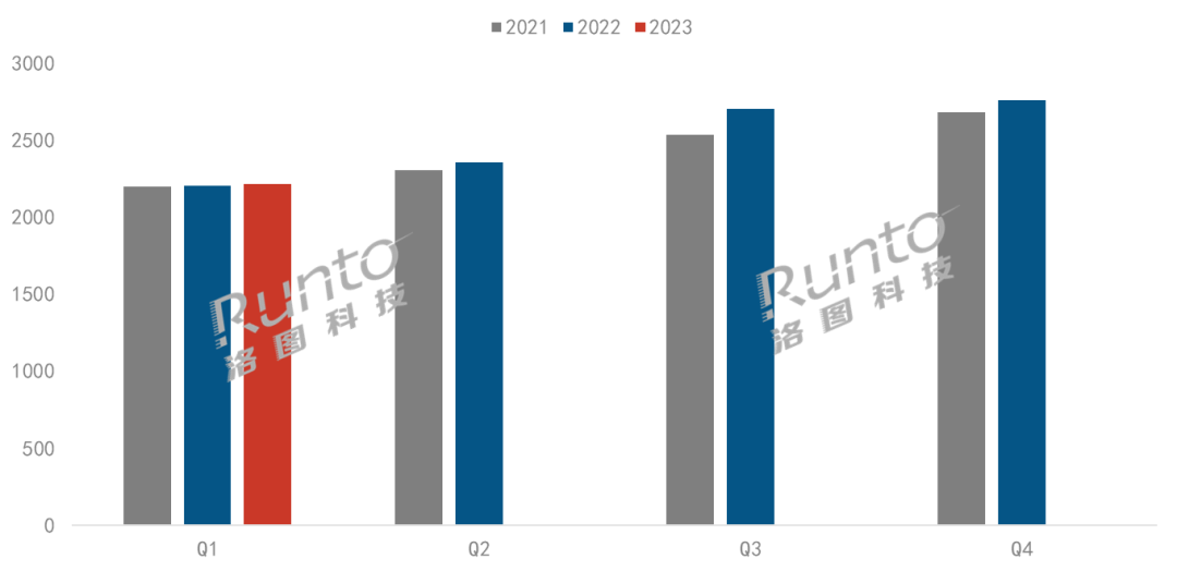 根據洛圖科技(RUNTO)發布的《全球電視代工市場出貨月度追蹤》報告,2023年第一季度,全球電視代工市場整體(含長虹、康佳、創維、海信四家自有工廠)出貨總量為2219萬臺,較2022年同期微增0.6%。2021-2023年 全球電視代工市場季度出貨量變化
