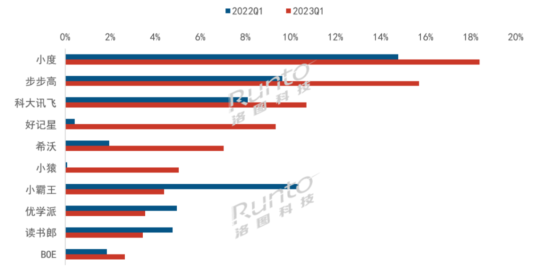 學習本市場中從業的品牌和整體智能平板市場有頗多不同。在今年第一季度,能在TOP10列位,且重疊的僅有兩個品牌:科大訊飛和小度。
