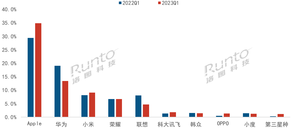 蘋果、華為、小米穩定在前三名,合計份額達57.4%。蘋果一季度份額達到34.9%,比去年同期增長了5.4個百分點,主要源于其在二三月份開學季推出了教育優惠政策和返校促銷降價。