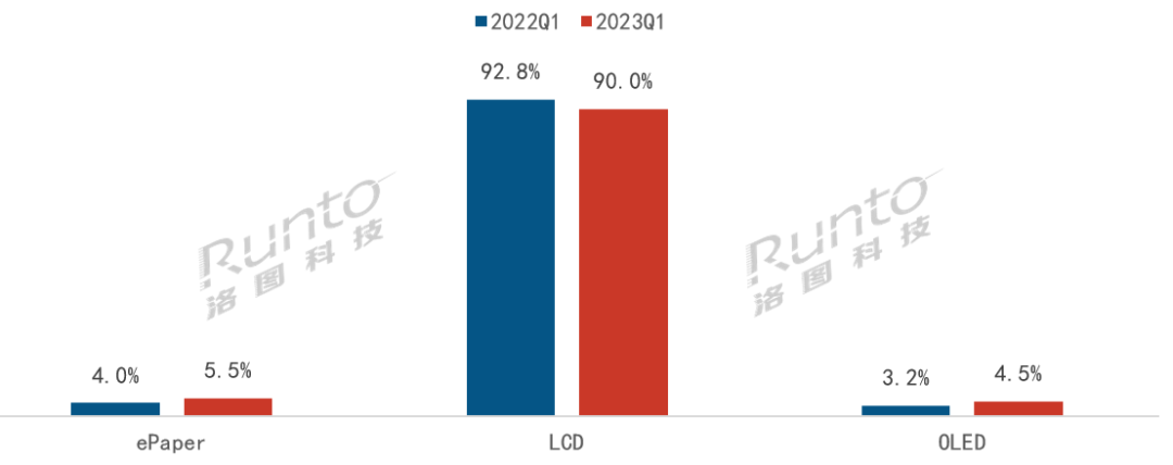 根據洛圖科技(RUNTO)線上監測數據顯示,2023年第一季度,智能平板屏幕類型以LCD(液晶顯示)為主,占比達到90%,較去年同期下降2.8個百分點;ePaper(電子紙)和OLED作為新興技術正在成長中,份額分別上漲1.5和1.3個百分點。合并占到約10%。