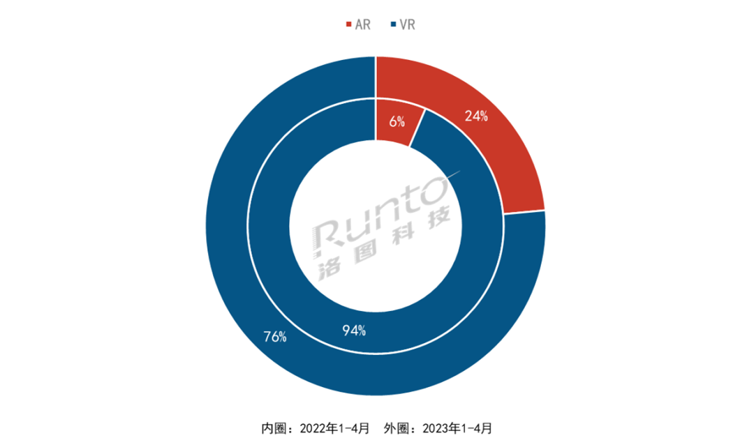 不過,細分產品的表現也并非全部不堪。中國市場中,AR和VR的表現截然相反。根據洛圖科技(RUNTO)線上監測數據顯示,2023年1-4月,VR設備的線上銷量同比下降37%;AR設備線上銷量同比上漲了182%。