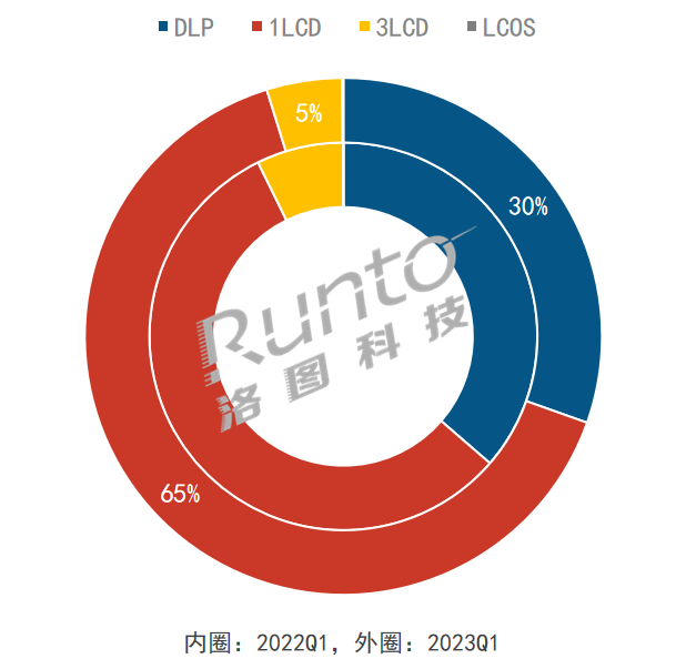 DLP產品出貨量持續下滑,根據洛圖科技(RUNTO)數據顯示,2023年第一季度同比下降22.4%,出貨量不足50萬臺,占比則降至30%。DLP投影市場中TOP4品牌為極米、堅果、當貝和峰米,合計份額達到60.6%。