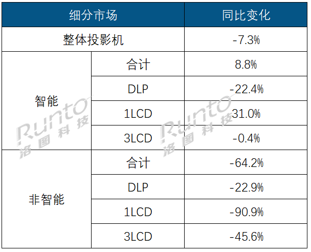 投影機出貨和智能投影零售的趨勢走向不同的原因,一方面在于出貨(Sell in)和零售(Sell out)的口徑差異;更核心的原因在于,中國市場的非智能投影正在快速淘汰,同比下滑64.2%,其撤退速度極大的拉低了整體市場大盤。