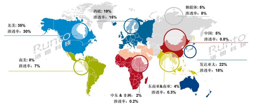 根據洛圖科技(RUNTO)數據顯示,Soundbar在北美、西歐和發達亞太地區的銷量占比分別達到了35%、19%和22%;家庭滲透率均在20%-30%左右,而在中國、東南亞以及中東非等國家和地區的占比不足5%,家庭滲透率也不及1%,遠遠落后于經濟較為發達的國家。