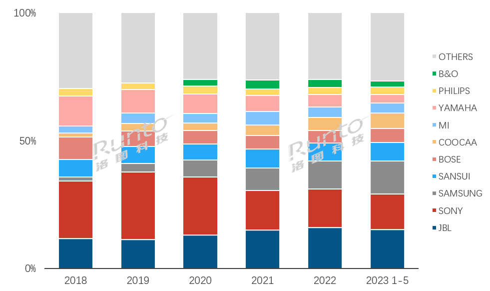 三星依靠強大全面的產品線布局以及口碑出色的中高端全景聲產品迅速搶占市場,2023年前五個月,份額已超13%位居市場前三。
