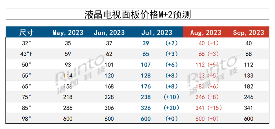 --32寸/43寸:7月分別上漲2和3美元,至39和65美元,小客戶價格達到40和67美元;預計8月仍有1和3美元的漲幅,至此,32寸產品已達到目標價40美元。