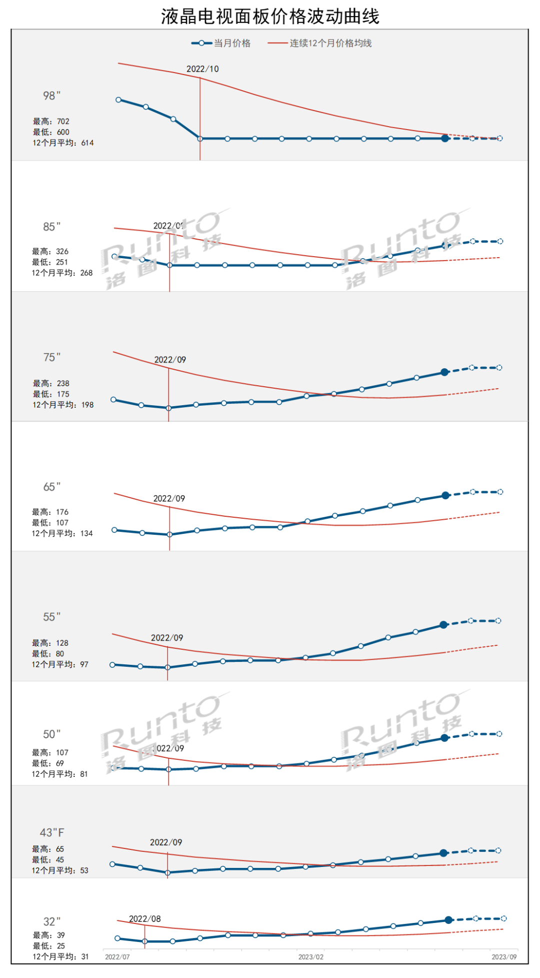 數據來源:洛圖科技(RUNTO),單位:美元2023年8月液晶電視面板價格趨勢