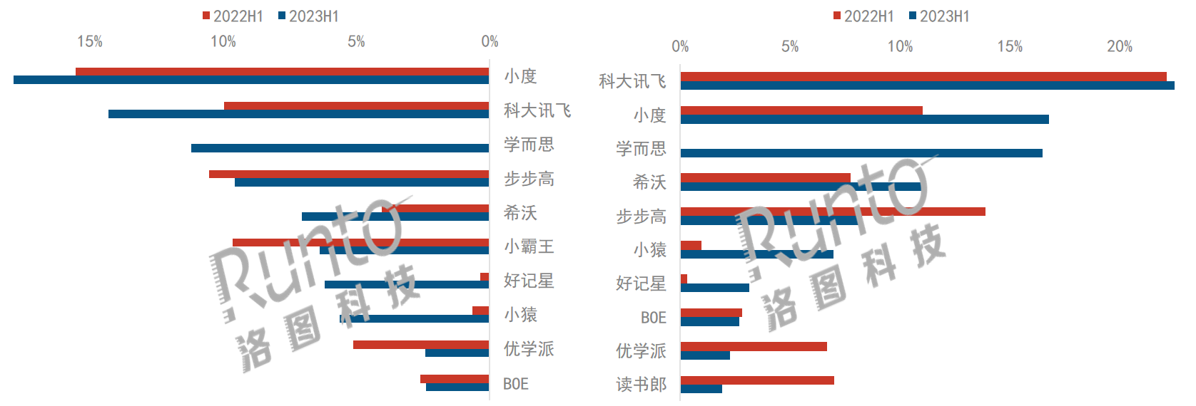 根據洛圖科技(RUNTO)線上監測數據顯示,2023年上半年,中國學習平板線上市場在售品牌數量為191個,較去年同期增加了14個;TOP10品牌合計銷量份額為83%,較去年同期增長11.5個百分點。盡管參與者眾多,但資源開始向一線品牌聚集。