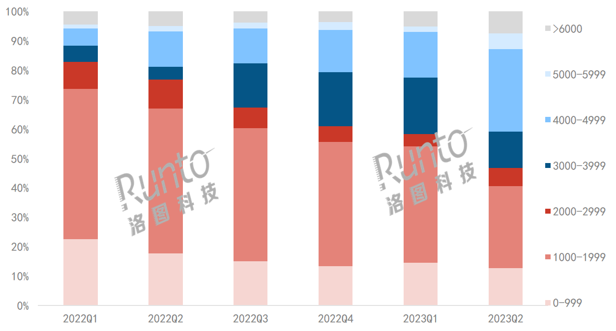 2022-2023Q2 中國學習平板線上市場分價格段結構