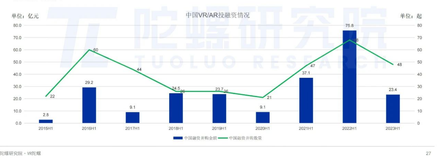 陀螺(luo)研究院·VR陀螺(luo)發(fa)布的VR/AR投融資(zi)(zi)報告(gao)顯示,2023年上半年中國(guo)VR/AR產業融資(zi)(zi)并購金額為23.4億元,同(tong)(tong)比(bi)下降(jiang)(jiang)69.2%;融資(zi)(zi)并購數量(liang)共(gong)48起,同(tong)(tong)比(bi)下降(jiang)(jiang)29.4%。國(guo)內VR/AR融資(zi)(zi)偏早期,今年上半年A輪融資(zi)(zi)企業占一(yi)半,元宇(yu)宙熱度(du)(du)下降(jiang)(jiang)后,VR/AR設(she)備(bei)銷(xiao)量(liang)未達預期,資(zi)(zi)本更為謹(jin)慎,國(guo)內融資(zi)(zi)活躍度(du)(du)下降(jiang)(jiang),融資(zi)(zi)額大幅縮水。