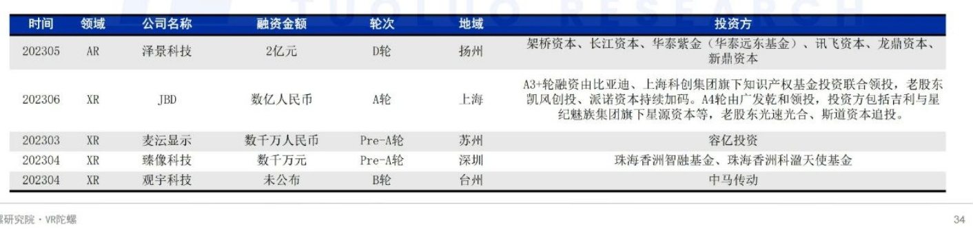2023年(nian)上(shang)(shang)半年(nian)硬(ying)件企業榜單(dan)來看(kan),融資(zi)(zi)額排名前10的企業基本(ben)都達到(dao)了億級,并且(qie)所有(you)企業都是硬(ying)件,其中(zhong)涵蓋VR/AR品(pin)牌終端、顯(xian)示屏(ping)、傳(chuan)感器(qi)、芯(xin)片、光(guang)學器(qi)件等。夢想綻放(奇遇R)、小派科(ke)技、雷(lei)鳥創新、大朋R、Rokid等VR/AR頭(tou)顯(xian)廠商(shang)上(shang)(shang)半年(nian)皆已完成過億元融資(zi)(zi)。從投資(zi)(zi)方(fang)來看(kan),大部分融資(zi)(zi)案(an)例中(zhong)都有(you)政(zheng)府(fu)(fu)基金參與(yu),如青(qing)(qing)島(dao)經控集團、青(qing)(qing)島(dao)海發集團、余(yu)杭國投、長江資(zi)(zi)本(ben)、深圳天使(shi)母基金、青(qing)(qing)島(dao)文投資(zi)(zi)本(ben)等,相對于(yu)財投,更偏重戰略的地方(fang)政(zheng)府(fu)(fu)更青(qing)(qing)睞上(shang)(shang)中(zhong)游產業鏈硬(ying)件企業。